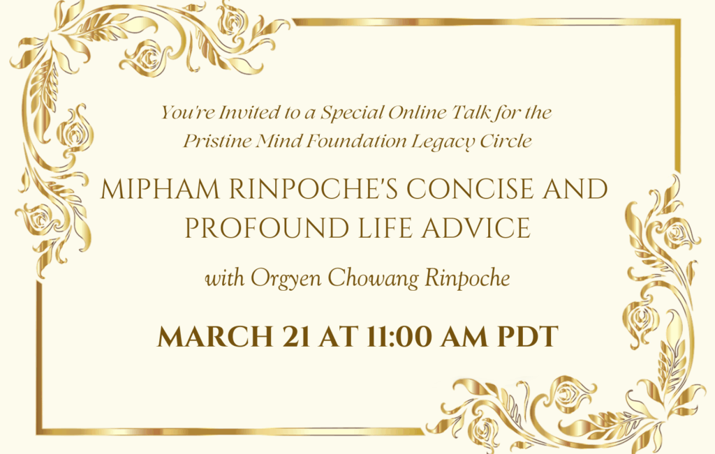 We invite you to join us for A Special Online Talk for the Pristine Mind Foundation Legacy Circle on Mipham Rinpoche’s Concise and Profound Life Advice with Orgyen Chowang Rinpoche! This talk will be held Online on Saturday March 21st at 11:00am Pacific Time.