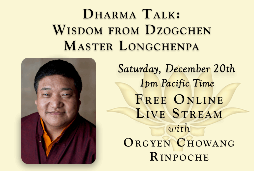 In this free live stream, Orgyen Chowang Rinpoche will be teaching on Dzogchen Master Longchenpa’s Wisdom. This session will include an opportunity for questions and answers.