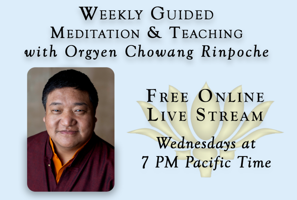 These free live stream sessions will include a brief teaching followed by guided meditation with meditation master Orgyen Chowang Rinpoche.
